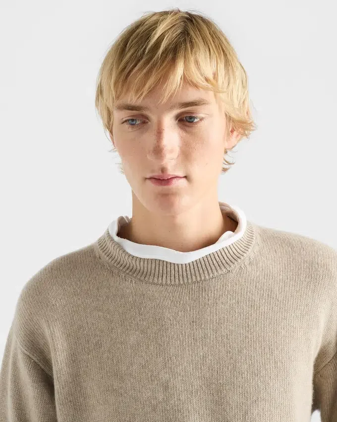 Classic Lines and Sleek Details Define This Refined Sweater Made of Soft Regenerated Cashmere with Ribbed Knit Trim. The Tonal Triangle Logo Completes the Refined and Versatile Style.