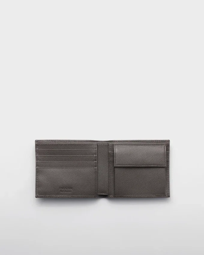 An Elegant Monochrome Wallet Decorated with the Triangular Logo in the Corner. Crafted Entirely from Hard-Wearing Saffiano Leather, the Bi-Fold Design Offers Ample Pockets for Coins, Bills and Cards.