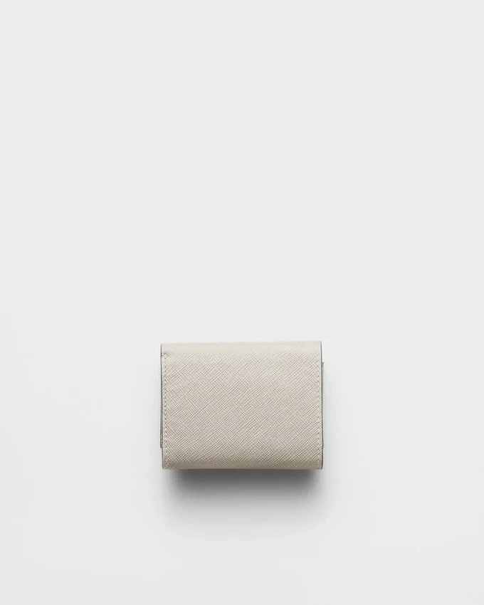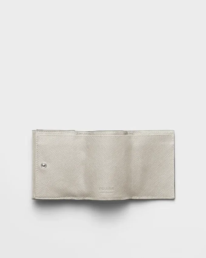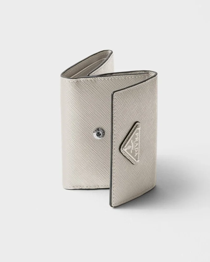 Sleek Lines and the Iconic Texture of Saffiano Leather Characterize This Wallet with the Triangle Logo on the Front. The Interior Comes with Pockets and Compartments.