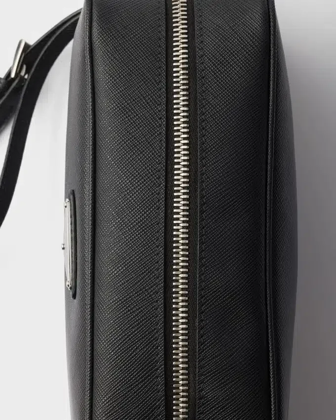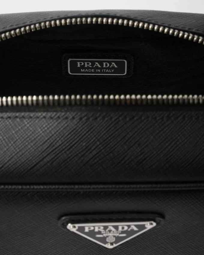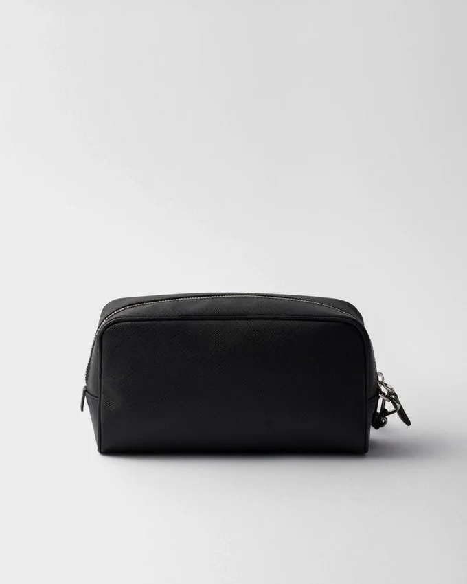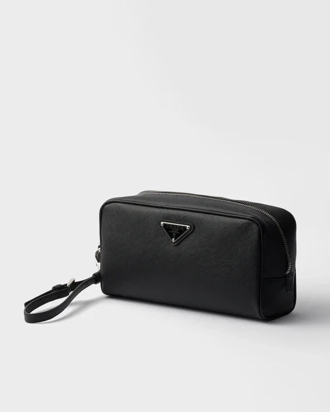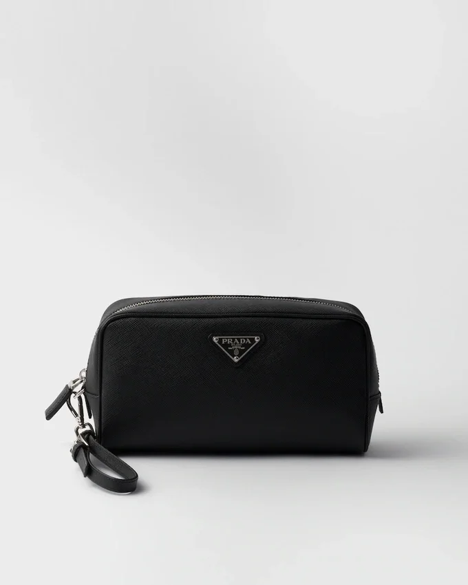 Saffiano Leather, Prada’s Iconic Material, is Defined by Its Crosshatch Texture and Waxed Finish That Gives This Pouch an Elegant and Versatile Style. The Accessory with Wristlet is Decorated with the Enameled Metal Triangle Logo.