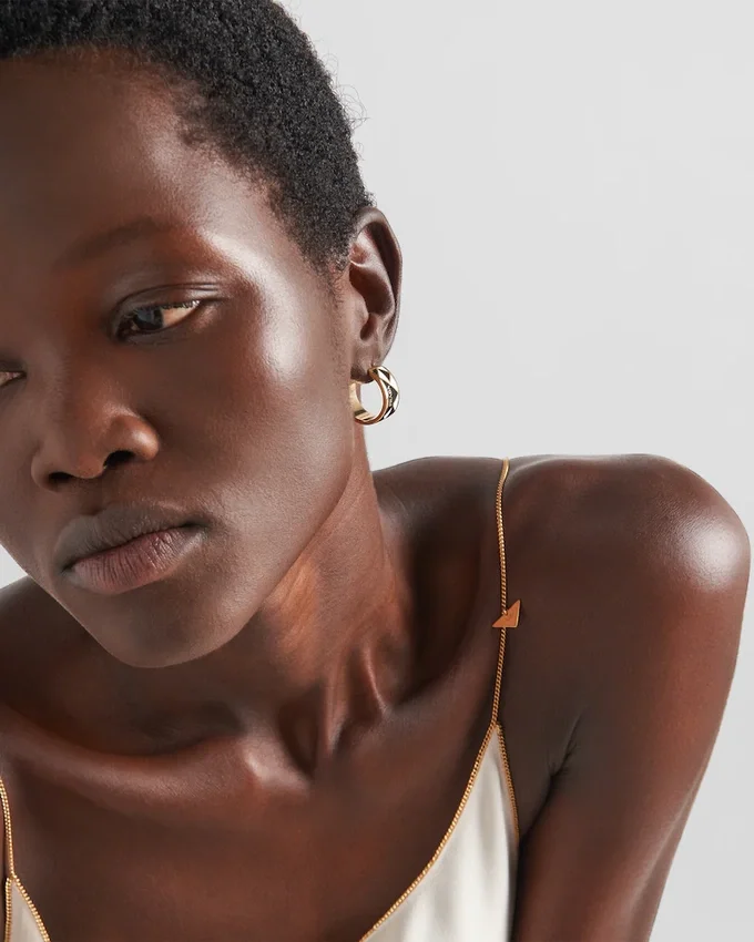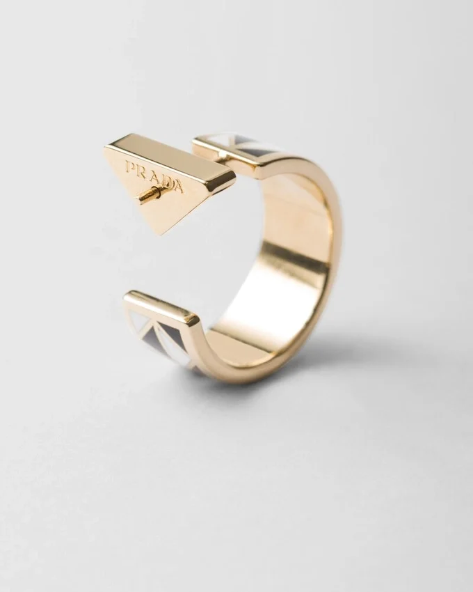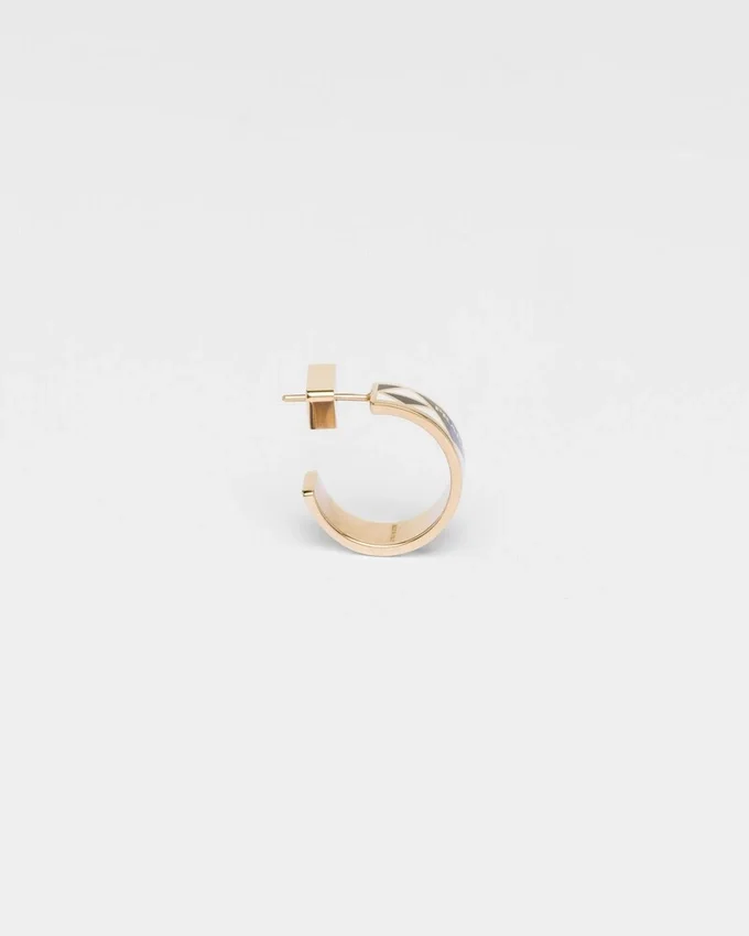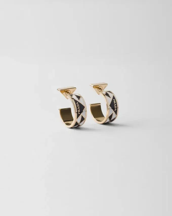 The Triangle, the Emblematic Signature of Prada Collections, is Transformed into a Modernist Pattern That Embellishes These Enameled Metal Earrings. The Half-Hoop Style with Modern Allure is Completed by the Lettering Logo.