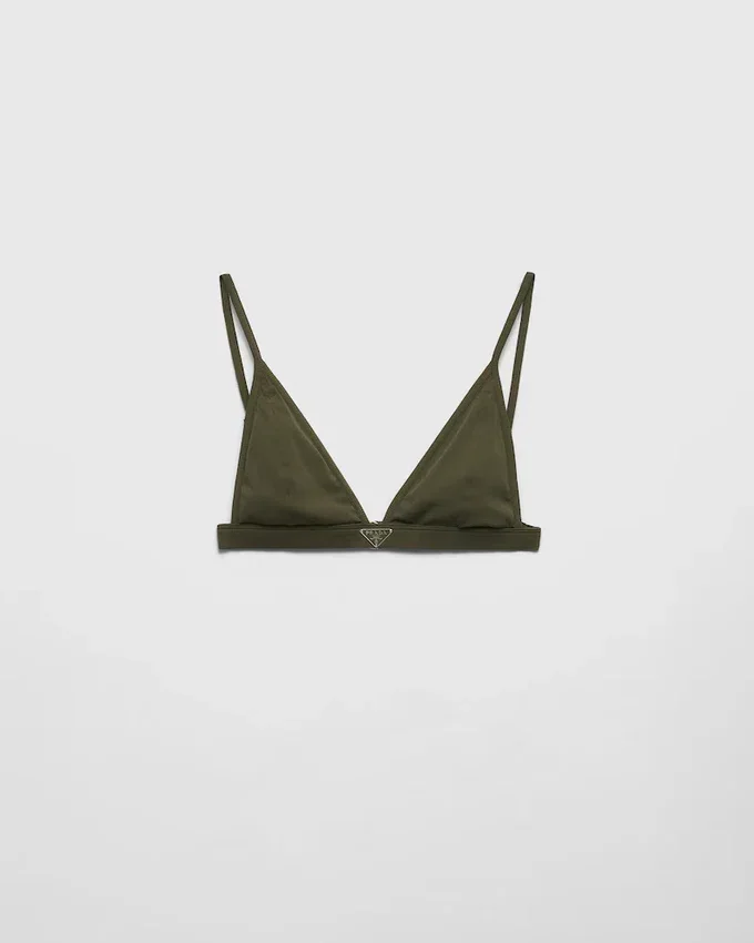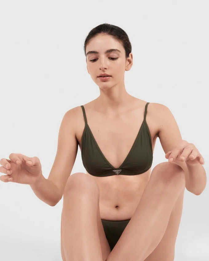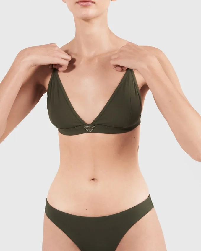 This Bralette Bikini Top Features a Sleek Design Defined by Thin Straps and Enriched with the Ribbed Knit. The Enameled Metal Triangle Logo Enhances the Style, Adding an Iconic Note. For Sustainable Care to Preserve the Product’s Characteristics and Reduce Microfiber Shedding, We Recommend Not Washing the Item Too Often. Let the Product Air out After Every Use and Have It Dry Cleaned at a Specialized Ecological Dry Cleaners.