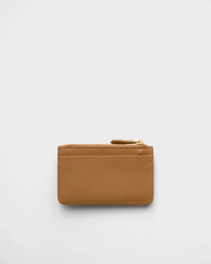 This Sophisticated Card Holder with Precious Allure Presents a Mix of Details in Smooth and Saffiano Leather, an Iconic Prada Material with a Crosshatch Texture. The Accessory Characterized by Its Minimalist Design is Embellished with the Iconic Enameled Triangle Logo of the Brand.