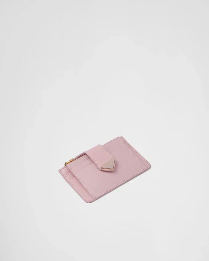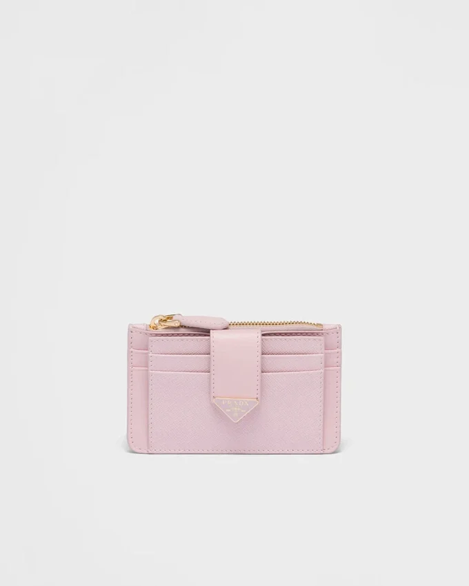This Sophisticated Card Holder with Precious Allure Presents a Mix of Details in Smooth and Saffiano Leather, an Iconic Prada Material with a Crosshatch Texture. The Accessory Characterized by Its Minimalist Design is Embellished with the Iconic Enameled Triangle Logo of the Brand.