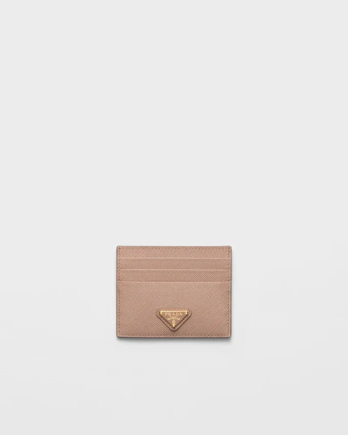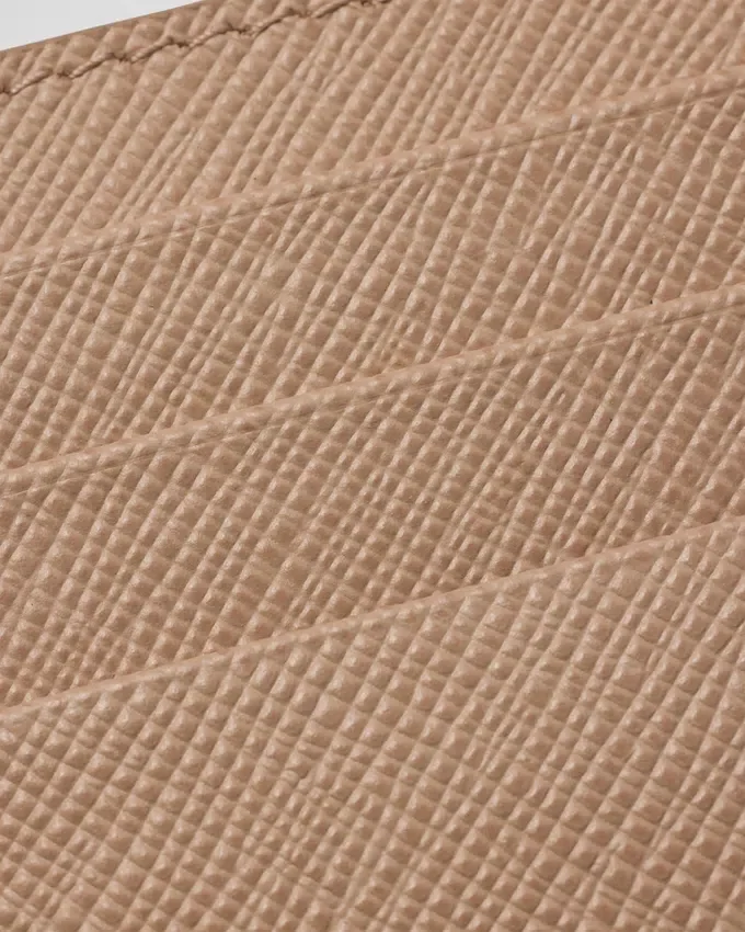 The Unmistakable Texture of Saffiano Leather Characterizes This Sleek Card Holder. The Accessory with Six Card Slots is Decorated with a Tonal Enameled Metal Triangle Logo.