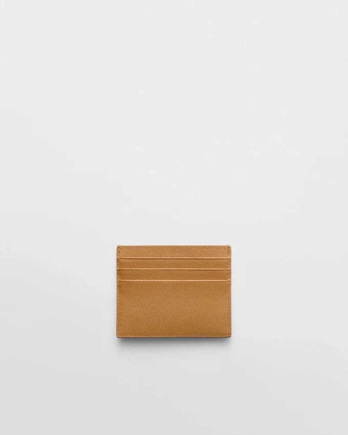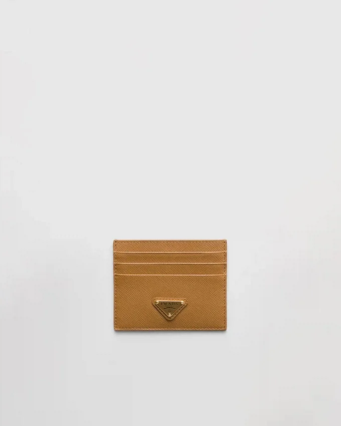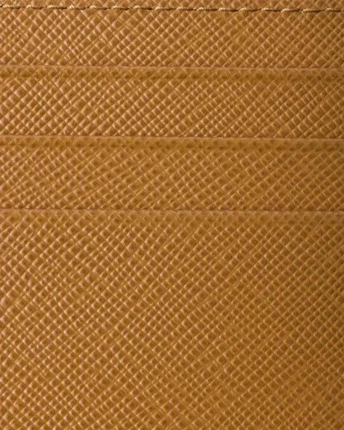 The Unmistakable Texture of Saffiano Leather Characterizes This Sleek Card Holder. The Accessory with Six Card Slots is Decorated with a Tonal Enameled Metal Triangle Logo.