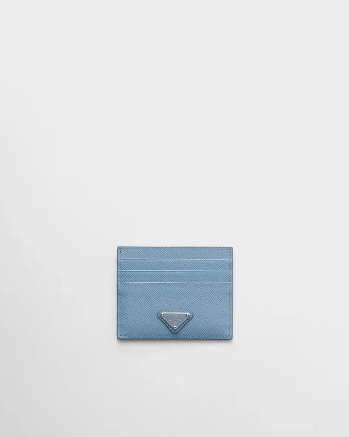 The Unmistakable Texture of Saffiano Leather Characterizes This Sleek Card Holder. The Accessory with Six Card Slots is Decorated with a Tonal Enameled Metal Triangle Logo.