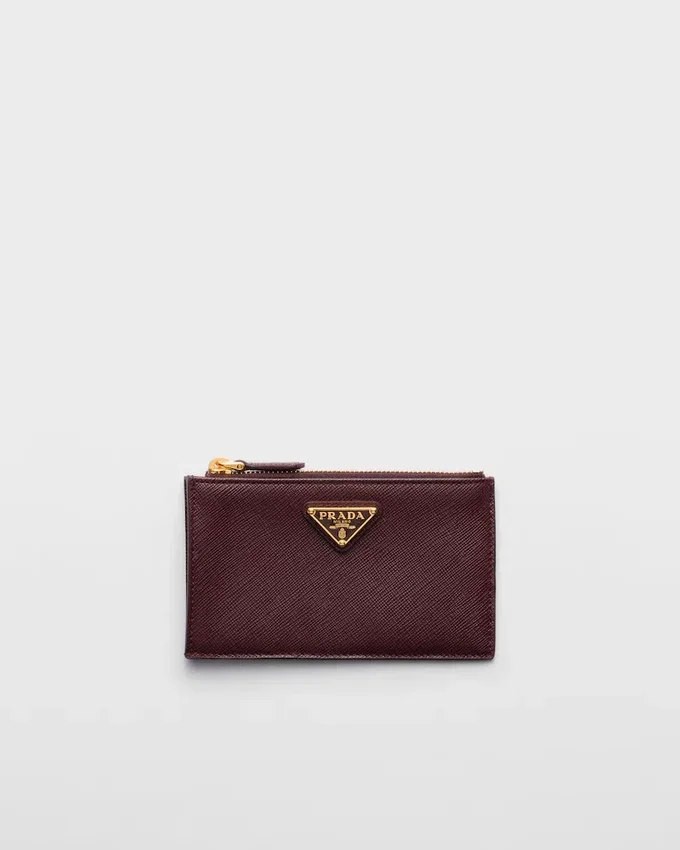 The Distinctive Crosshatch Texture of the Brand’s Iconic Saffiano Leather Characterizes This Card Holder with Sleek Lines. The Accessory with Five Card Slots is Decorated with the Metal Triangle Logo.