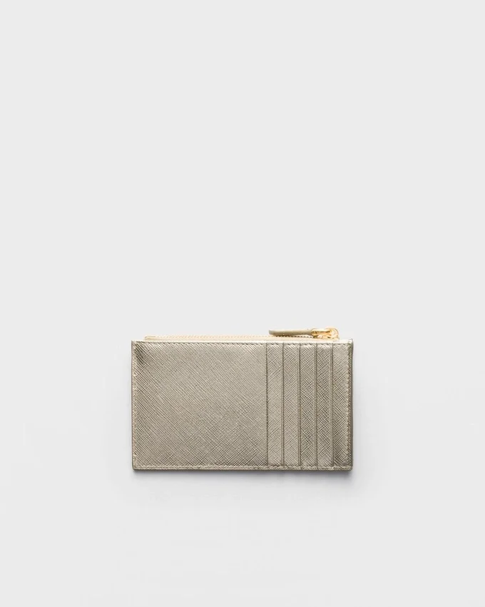 The Distinctive Crosshatch Texture of the Brand’s Iconic Saffiano Leather Characterizes This Card Holder with Sleek Lines. The Accessory with Five Card Slots is Decorated with the Metal Triangle Logo.