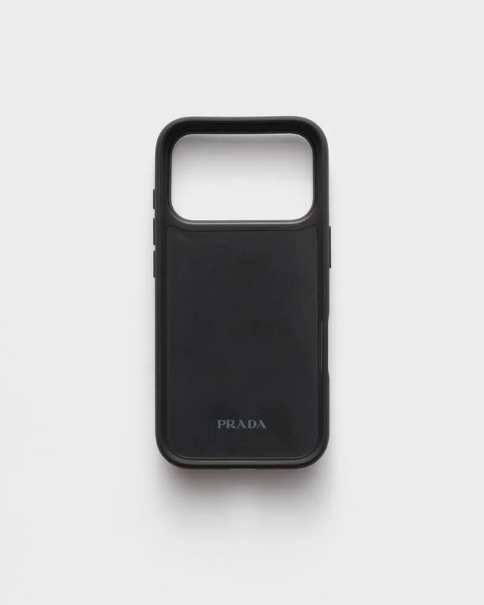 Combining Elegance and Functionality, This Saffiano Leather Case for the Iphone 17 Pro is Characterized by a Card Holder Pocket Decorated with the Enameled Metal Triangle Logo.