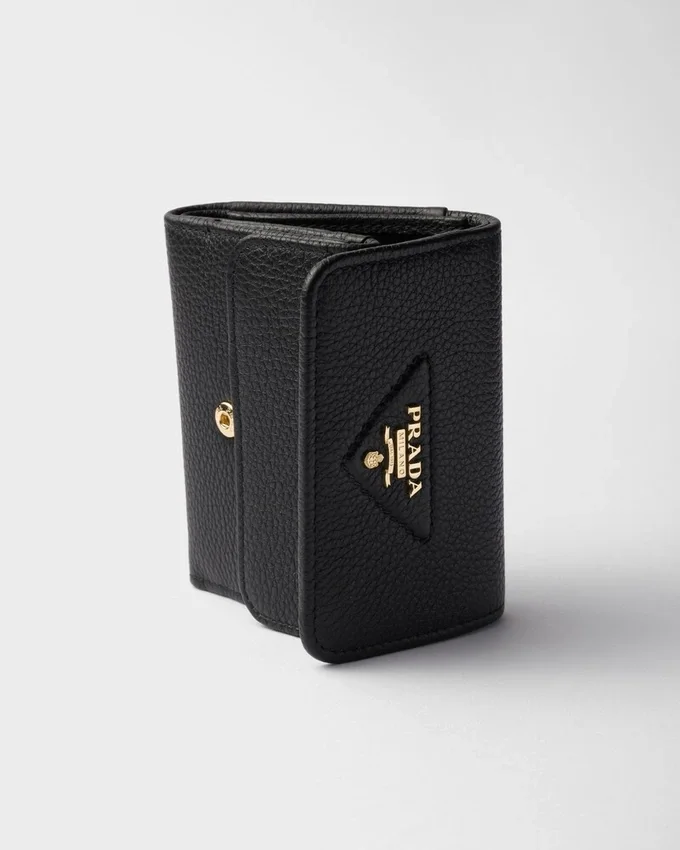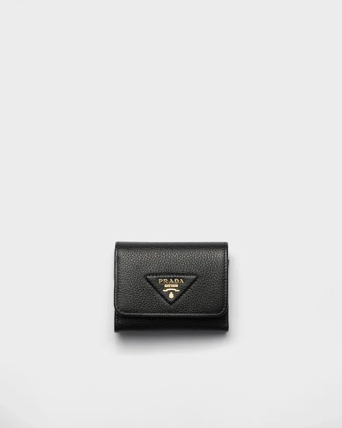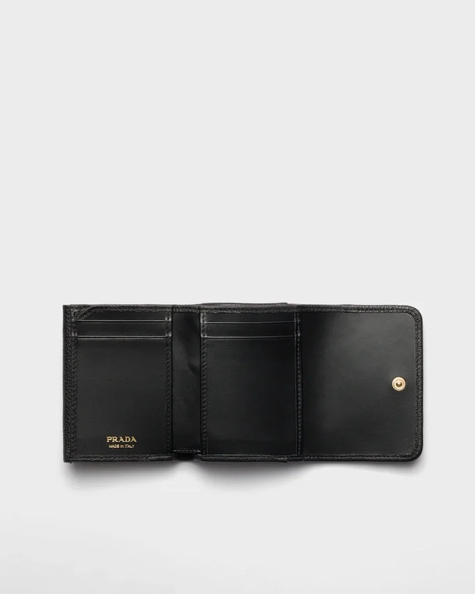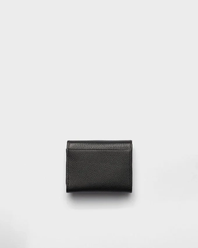 This Small Wallet Made of Leather Has Several Internal Pockets and Card Slots. The Accessory with Snap Closure is Decorated with the Metal Lettering Logo.