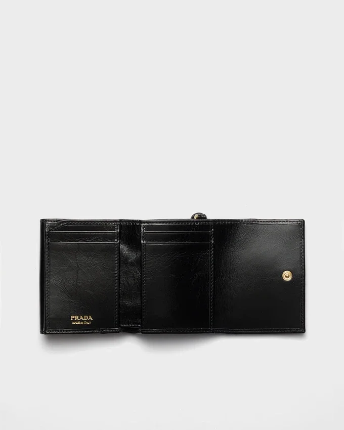 This Small Leather Wallet, Adorned with the Enamelled Metal Triangle Logo, Exudes Modern Sophistication. Its Refined Details and Fine Craftsmanship Make It a Timeless Accessory.