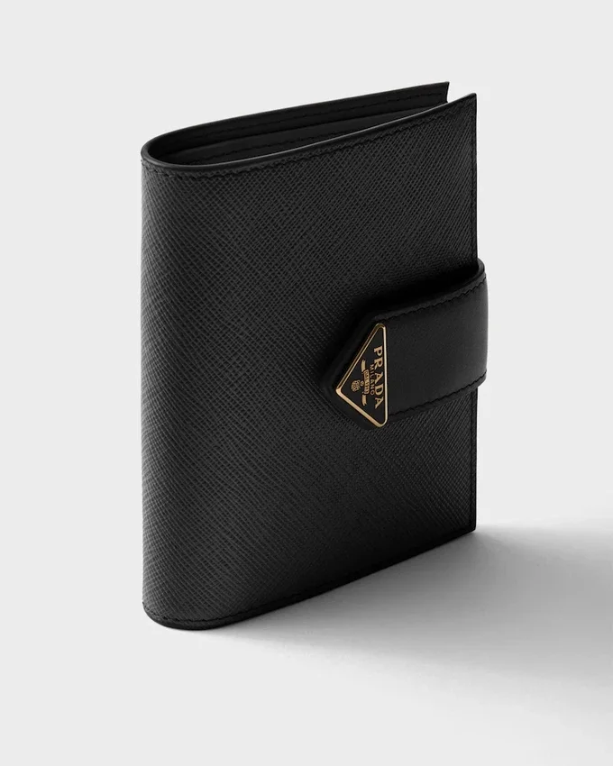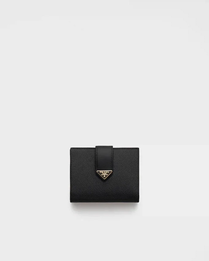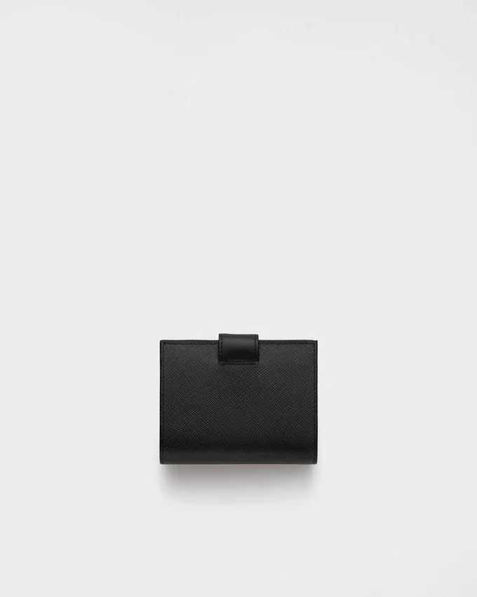 This Small Wallet with Sleek Elegance Comes in a Combination of Smooth and Saffiano Leather, an Iconic Prada Material with a Crosshatch Texture. Characterized by Its Minimal Design and Equipped with Several Compartments and Pockets, the Accessory is Accented with the Iconic Enameled Triangle Logo of the Brand Embellishing the Closure.