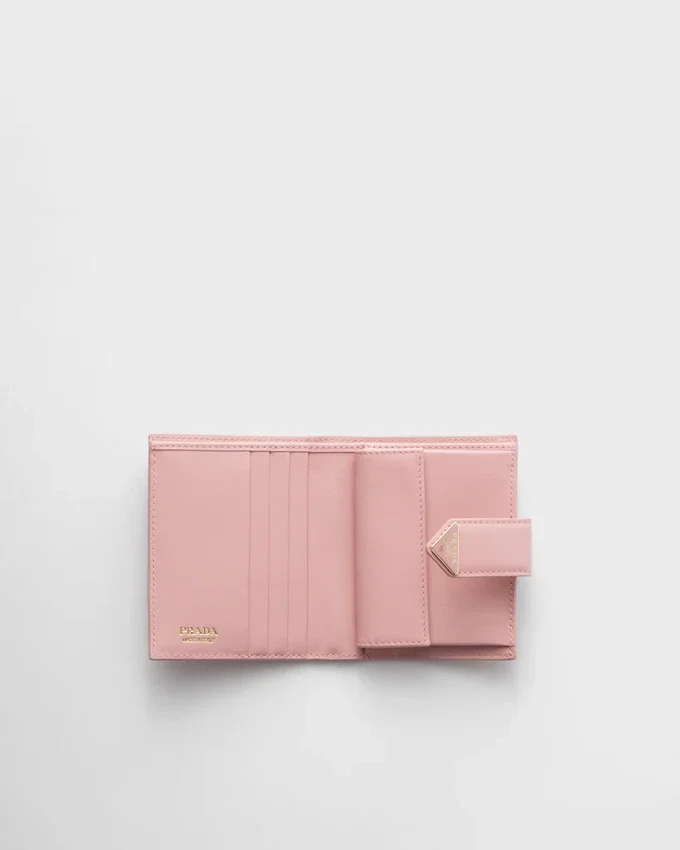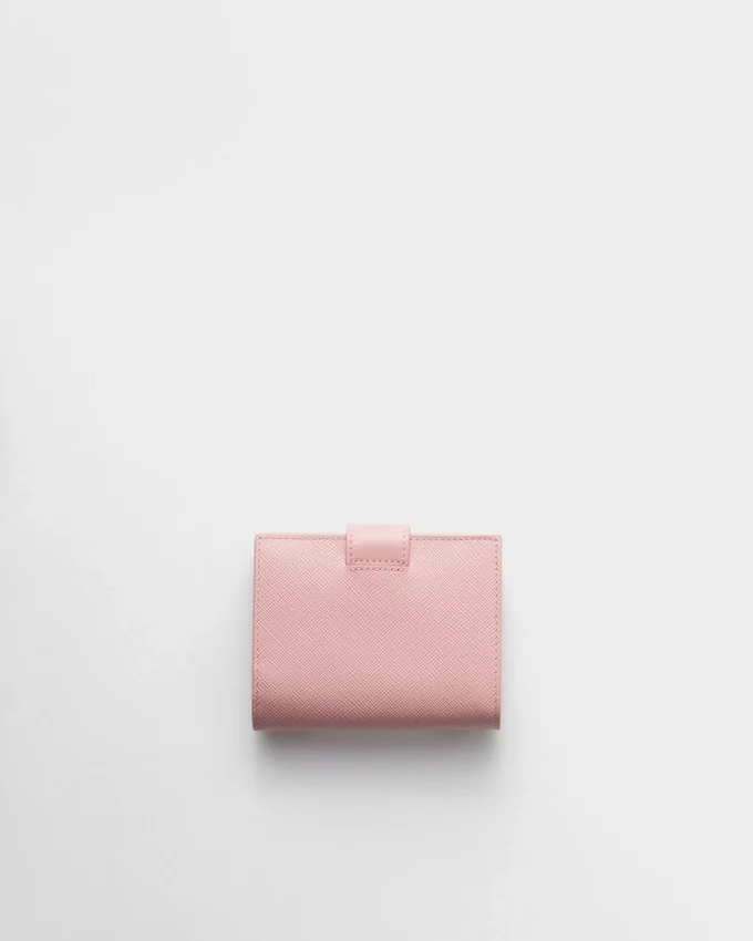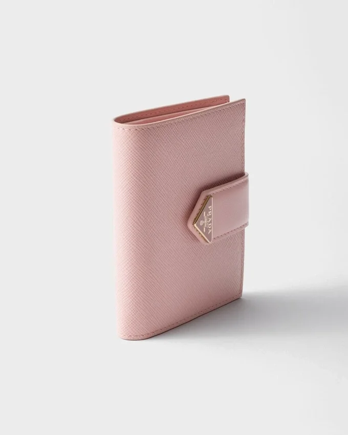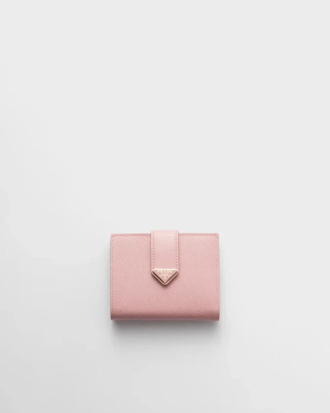 This Small Wallet with Sleek Elegance Comes in a Combination of Smooth and Saffiano Leather, an Iconic Prada Material with a Crosshatch Texture. Characterized by Its Minimal Design and Equipped with Several Compartments and Pockets, the Accessory is Accented with the Iconic Enameled Triangle Logo of the Brand Embellishing the Closure.