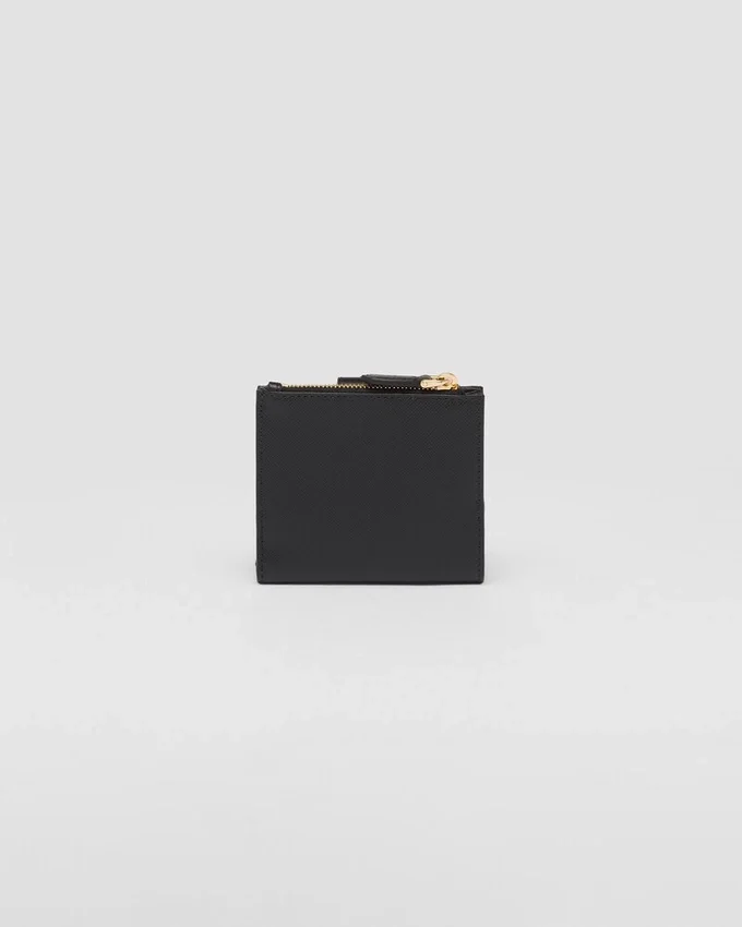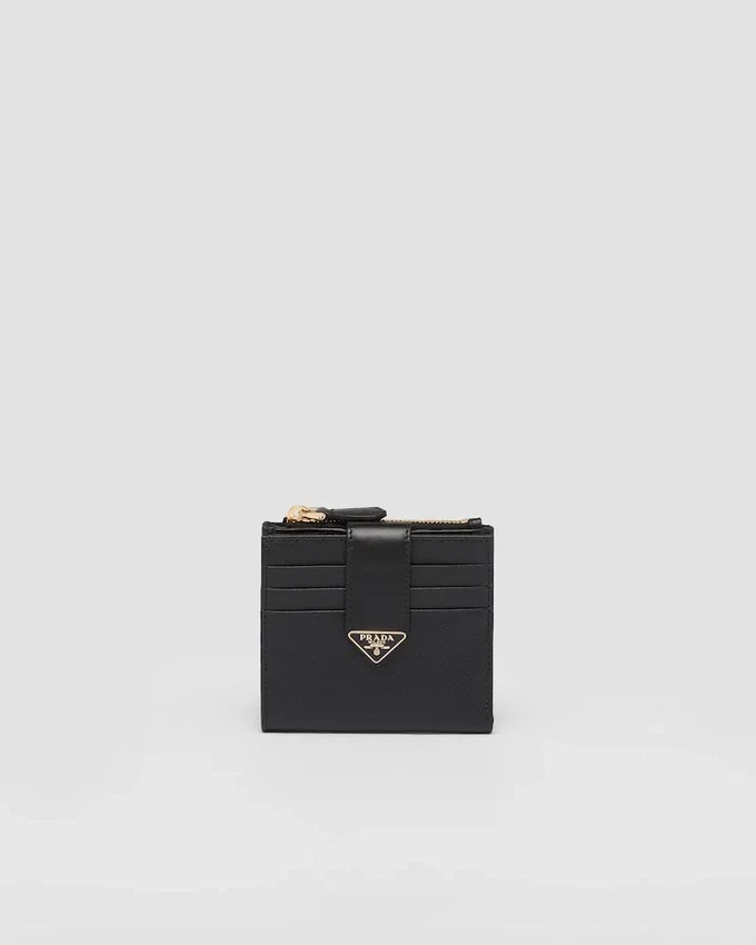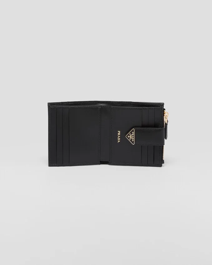 This Wallet with Sophisticated and Precious Allure Has Visible Card Slots and Comes in a Mix of Details in Smooth and Saffiano Leather, an Iconic Prada Material with a Crosshatch Texture. Characterized by Its Minimalist Design, the Accessory Features the Iconic Enameled Triangle Logo of the Brand That Decorates the Closure.
