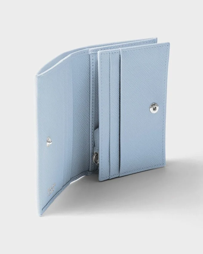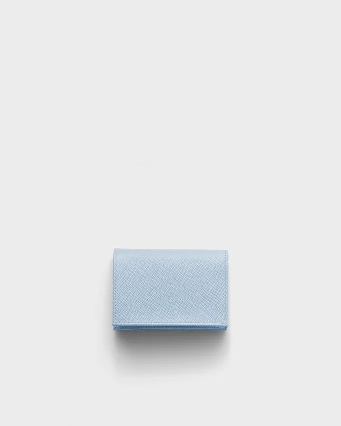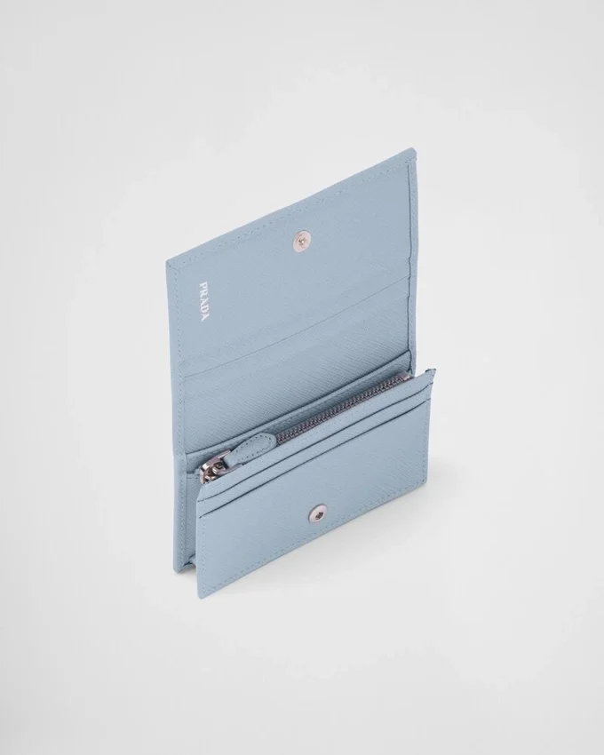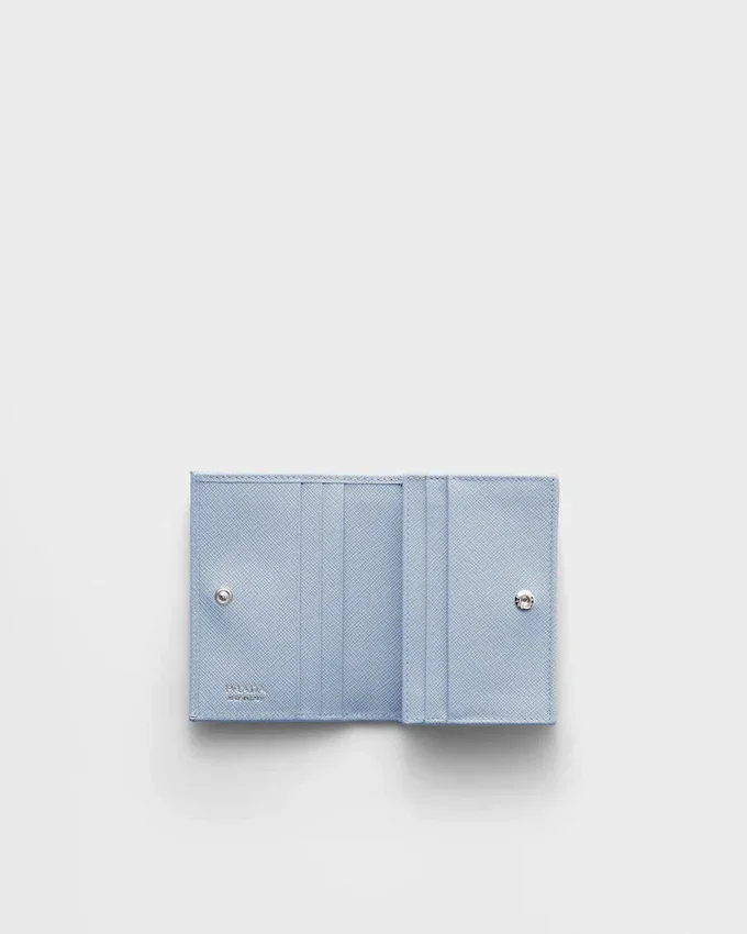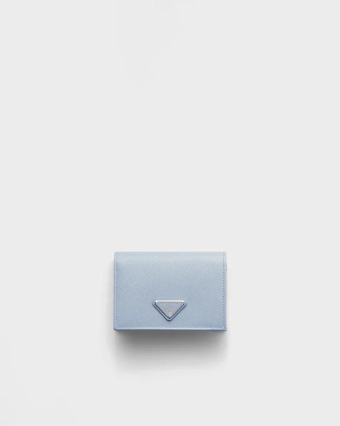 This Saffiano Leather Wallet with Enameled Metal Triangle Logo Expresses Sleek Elegance. The Accessory with Clean Lines Has a Zipper Coin Compartment, Bill Compartment, and Four Card Slots.