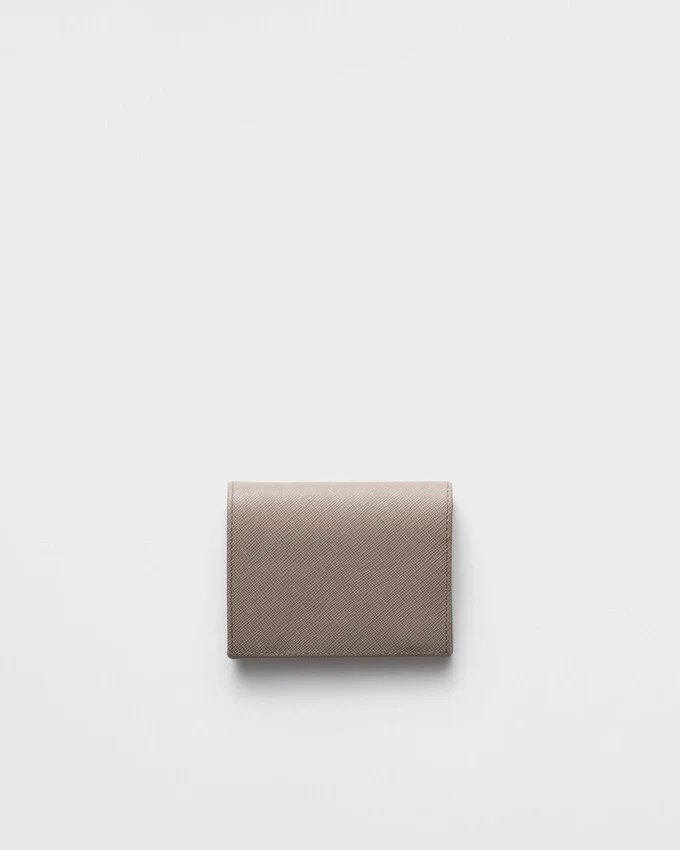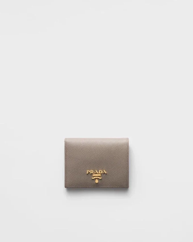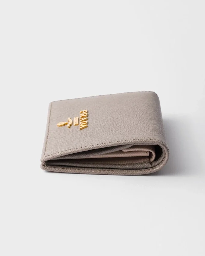 A Saffiano Leather Bi-Fold Wallet Embellished with Gold-Toned Prada Lettering. The Snap Closure Reveals Card Slots, a Bill Compartment and Coin Compartment, All Decorated with a Colorful Design.