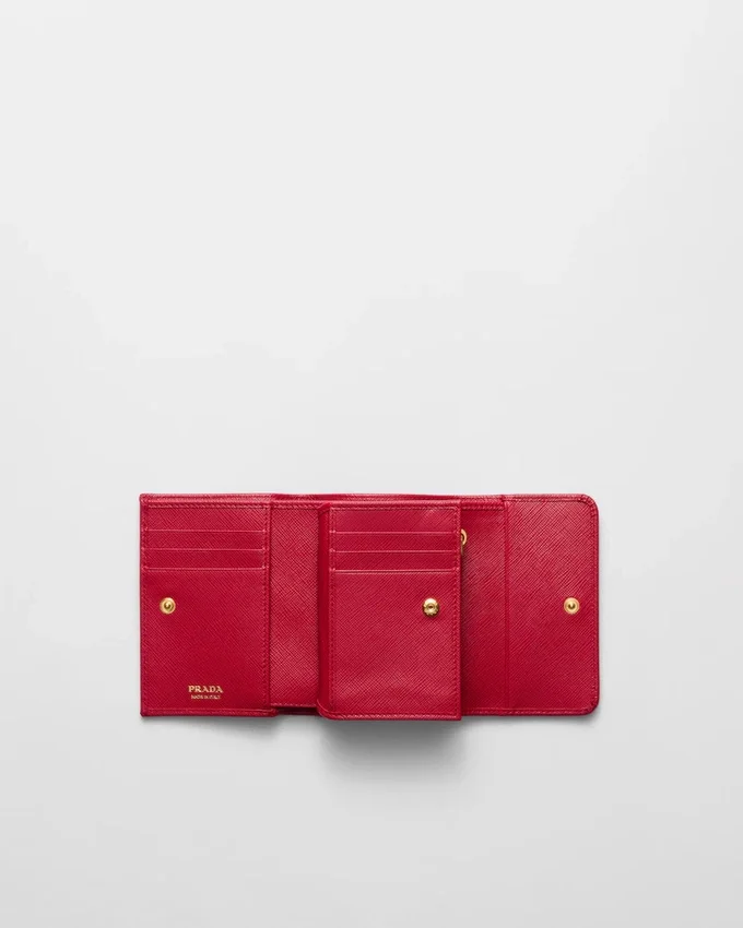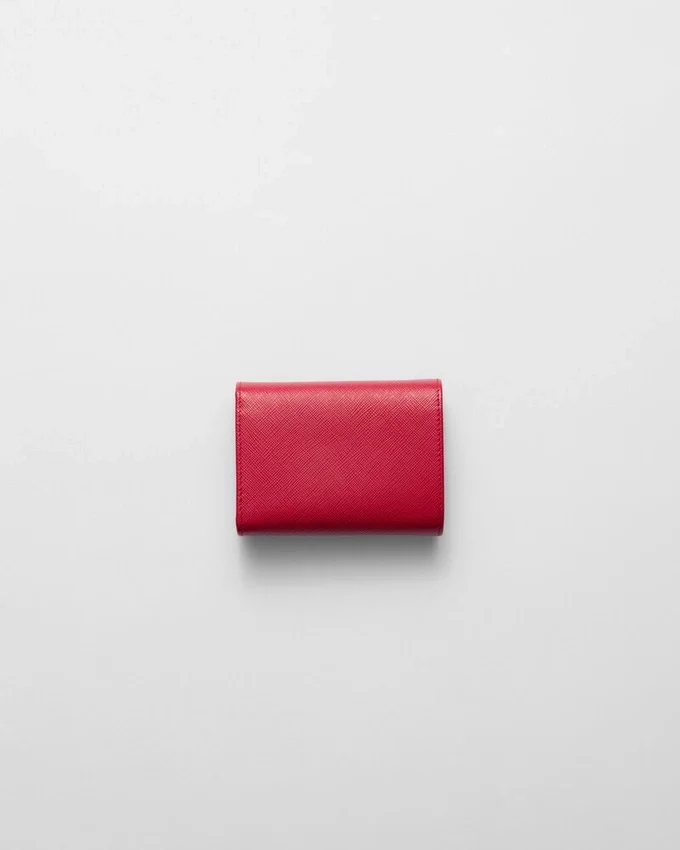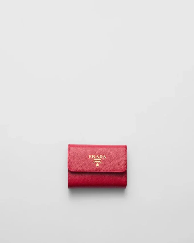 This Saffiano Leather Wallet with the Metal Logo on the Front Flap Has a Compact, Modern Design.
