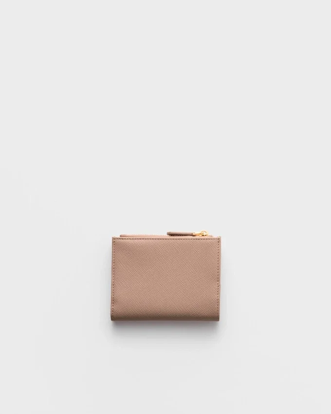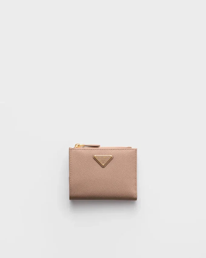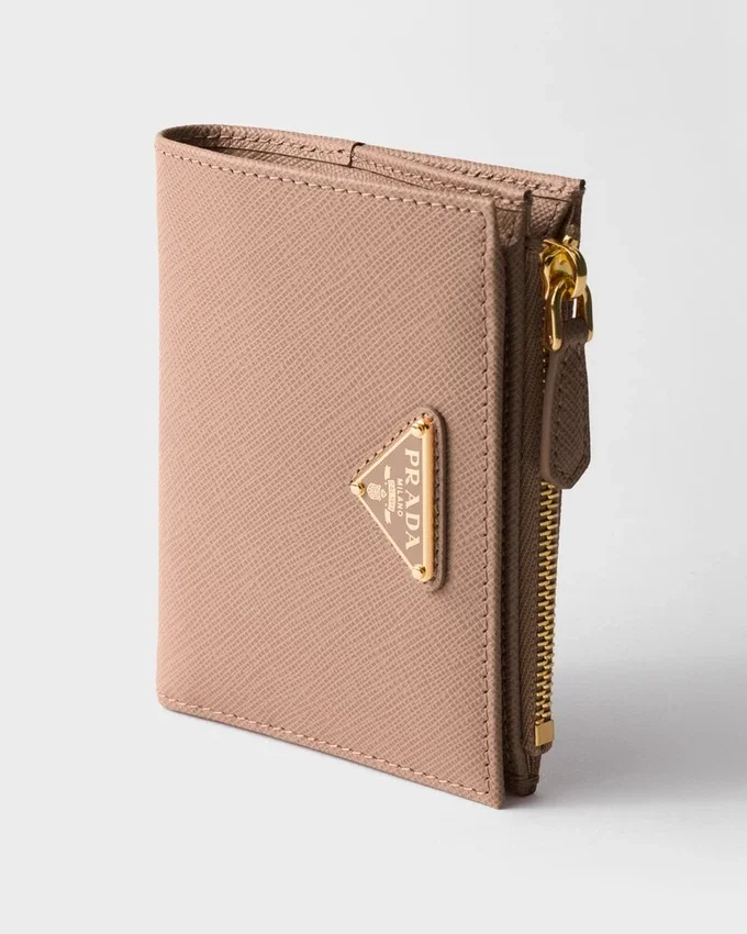 This Saffiano Leather Wallet with Enameled Metal Triangle Logo is Sleek and Elegant. The Accessory with Clean Lines Has a Zipper Coin Compartment, Bill Compartment, and Card Slots.
