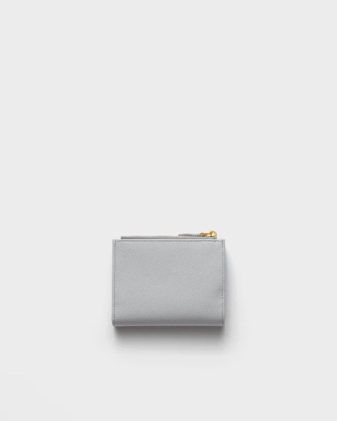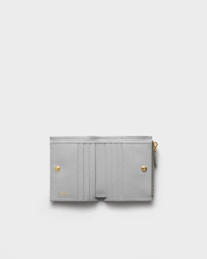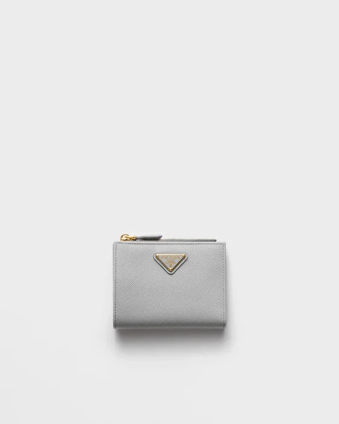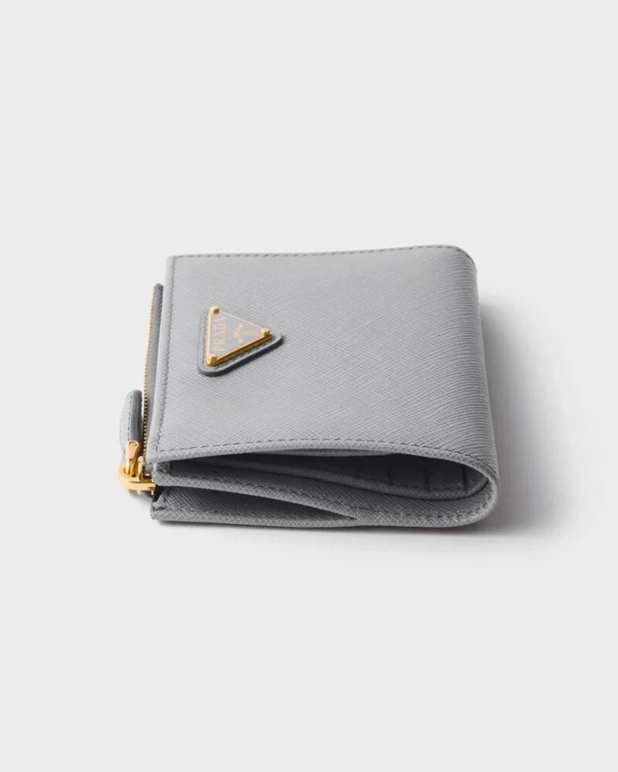 This Saffiano Leather Wallet with Enameled Metal Triangle Logo is Sleek and Elegant. The Accessory with Clean Lines Has a Zipper Coin Compartment, Bill Compartment, and Card Slots.