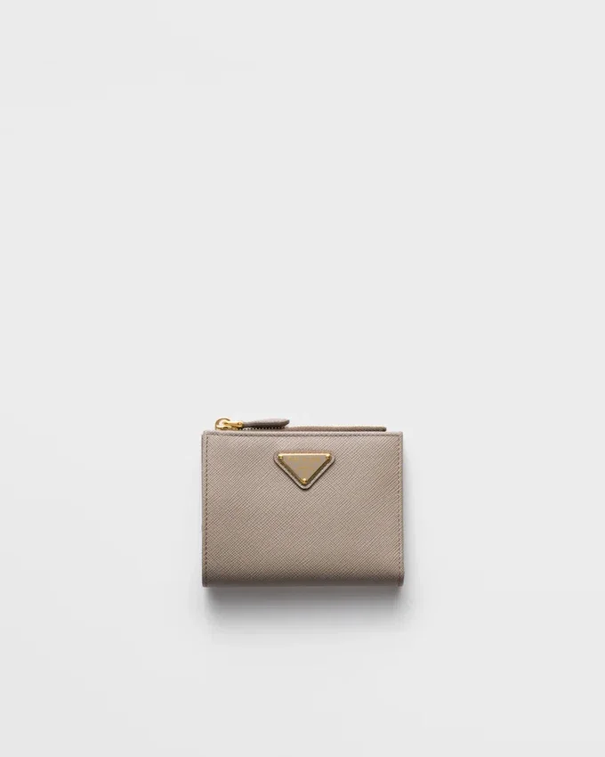 This Saffiano Leather Wallet with Enameled Metal Triangle Logo is Sleek and Elegant. The Accessory with Clean Lines Has a Zipper Coin Compartment, Bill Compartment, and Card Slots.