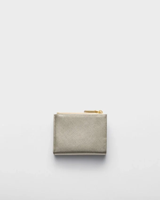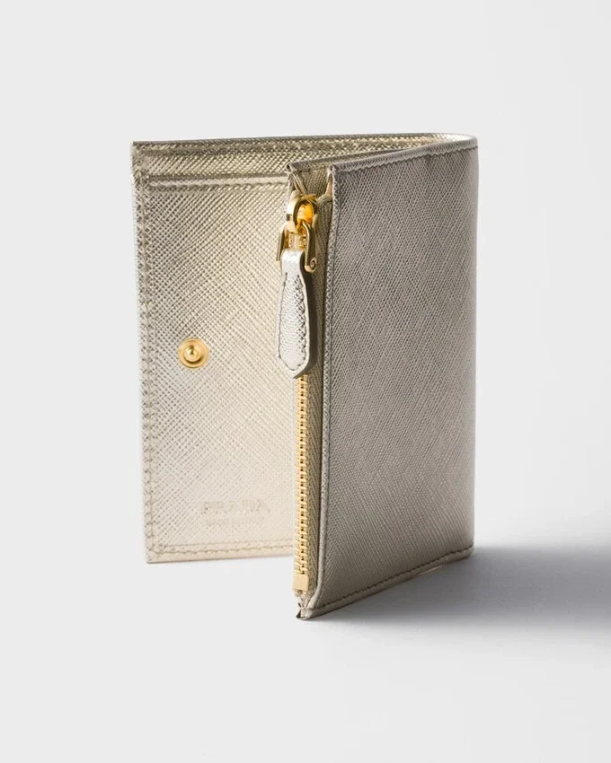 This Saffiano Leather Wallet with Enameled Metal Triangle Logo is Sleek and Elegant. The Accessory with Clean Lines Has a Zipper Coin Compartment, Bill Compartment, and Card Slots.
