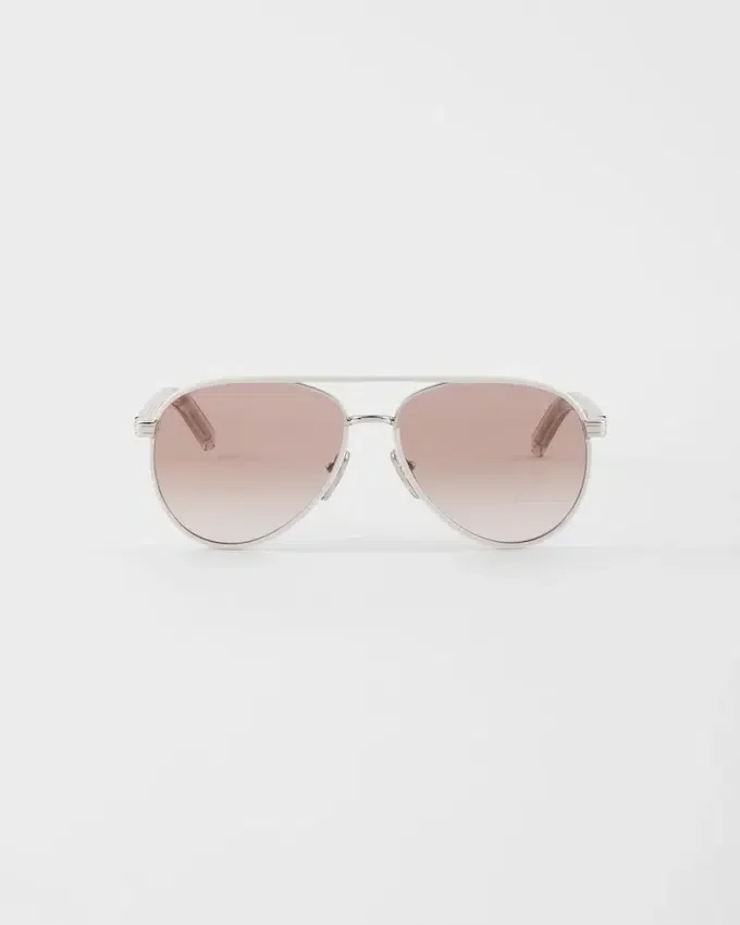Sleek Lines and Refined Details Give These New Prada Sunglasses a Sense of Contemporary Elegance. The Metal Aviator Frame Front Has Teardrop Lenses Enhanced by Colored Acetate Rims. The Slim Temples Are Enriched by the Metal Plaque with the Prada Lettering Logo.