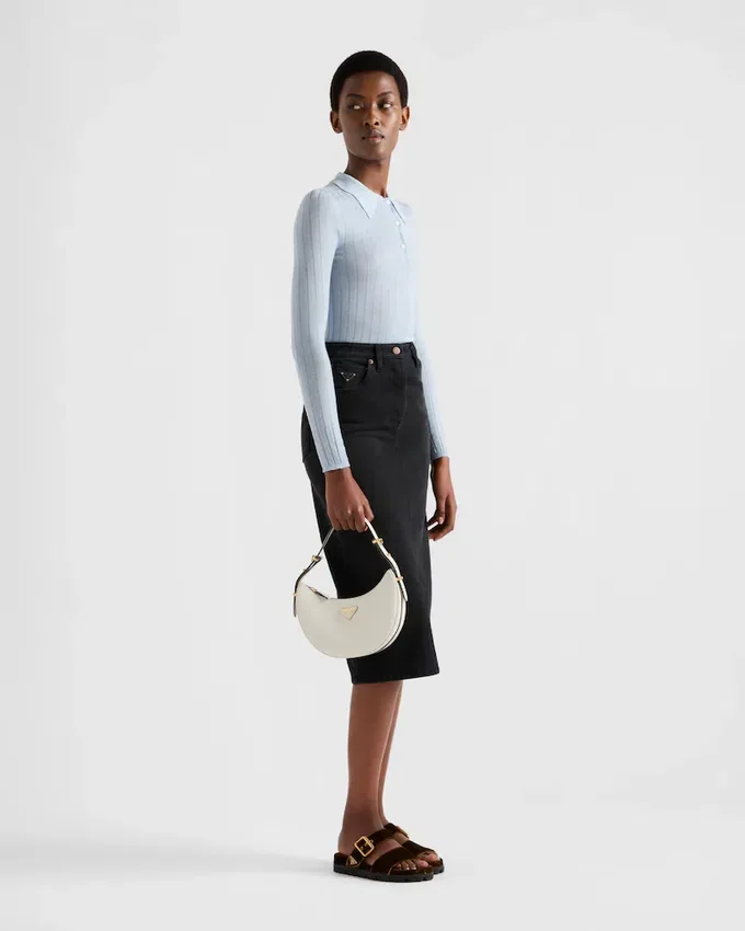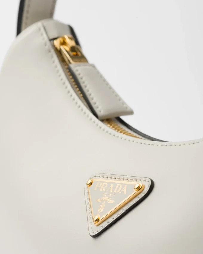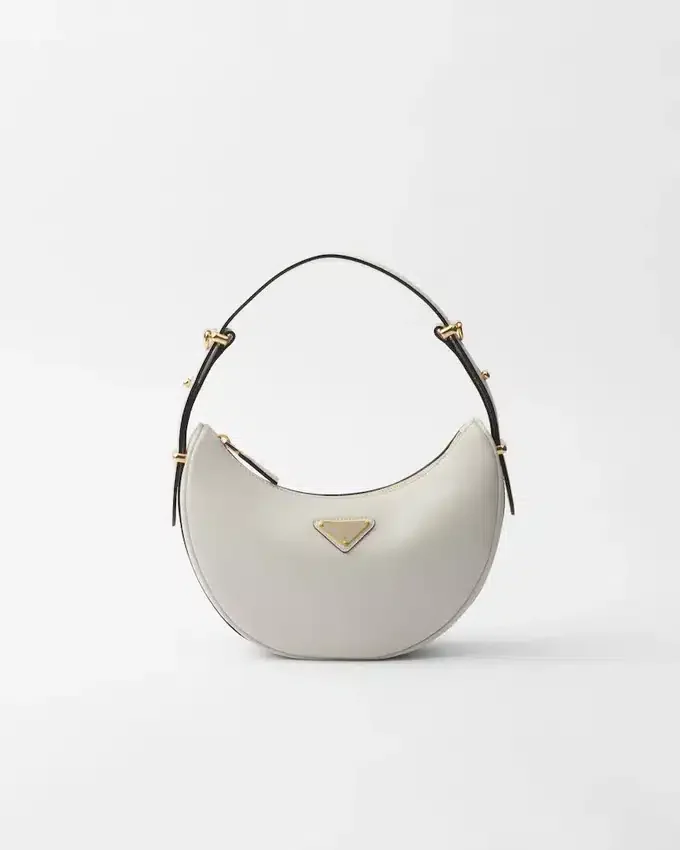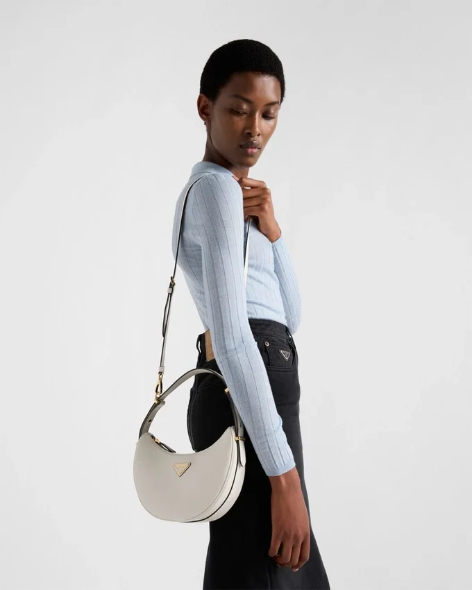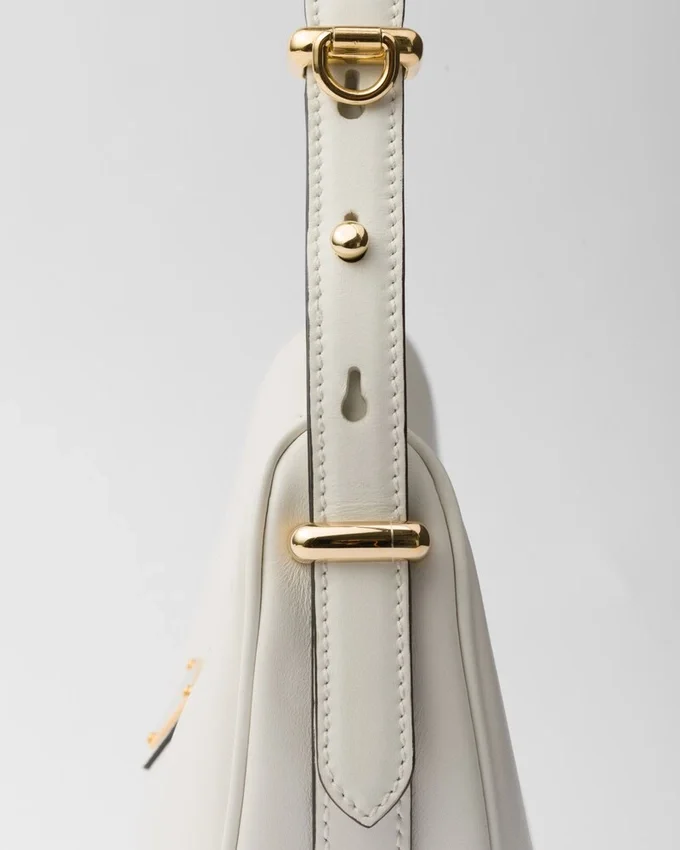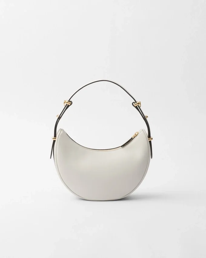 This Sleek Leather Bag Has a Versatile, Modernist Allure. The Accessory with a Sinuous Silhouette is Completed by the Leather Extension and Detachable Shoulder Strap for Wearing Different Ways. The Bag with Nappa Leather Interior and Metal Hardware is Embellished with the Enameled Metal Triangle Logo on the Front.
