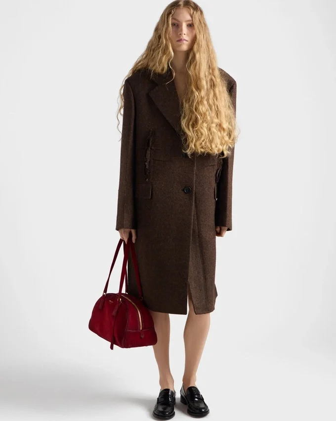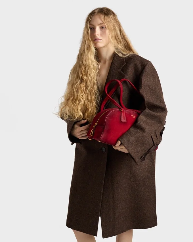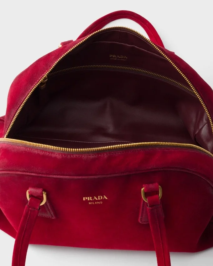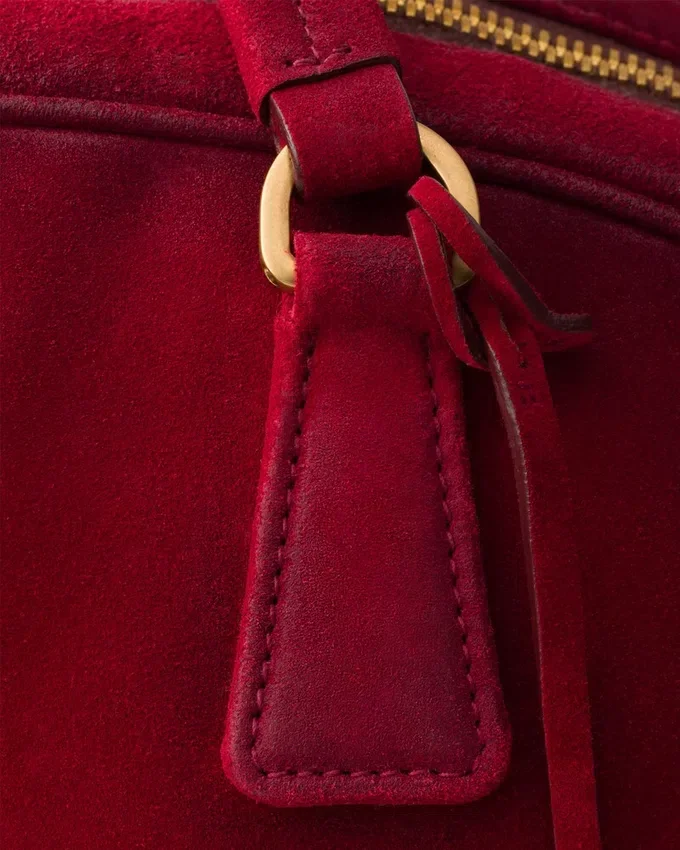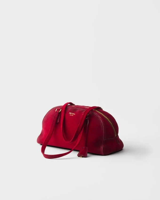 This Bag with a Silhouette Inspired by Prada Archives is the Perfect Synthesis of Craftsmanship, Tradition and Modernity. The Design Reinterprets the Iconic Bowling Bag with New Proportions, Sophisticated Materials, and Innovative Details. The Style is Given an Artisan Finish to Create a Vintage Effect That Adds Depth to the Texture of Suede, While Long Handles Complete the Accessory with a Versatile Note.