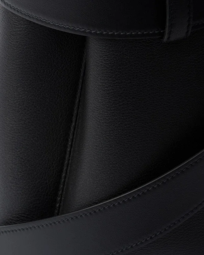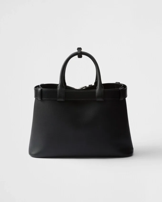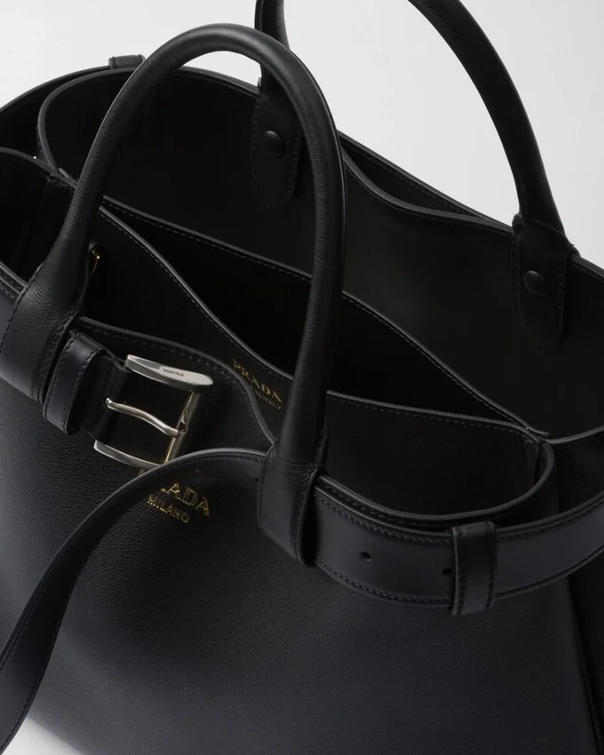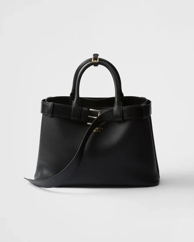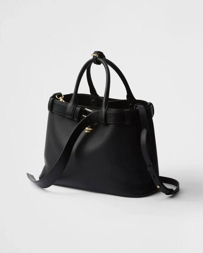 Clean Lines and Refined Elements Express the Dual Aesthetic of Prada That Moves Between Simplicity and Detail, Functionality and Elegance. This Leather Bag, with Nappa Interior and Center Pocket, Summarizes the Codes of the Brand in a Pragmatic but Sophisticated Design. The Silhouette is Embellished with a Wide Belt Enhanced by Its Used Effect That Gives the Accessory a Unique, Contemporary Touch. The Embossed Lettering Logo in 22 Karat Gold-Leaf Decorates the Modern and Versatile Style.