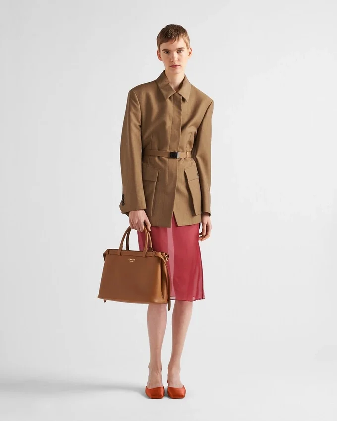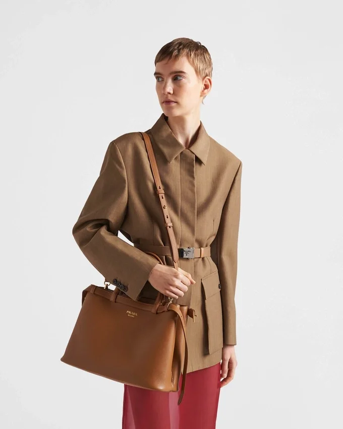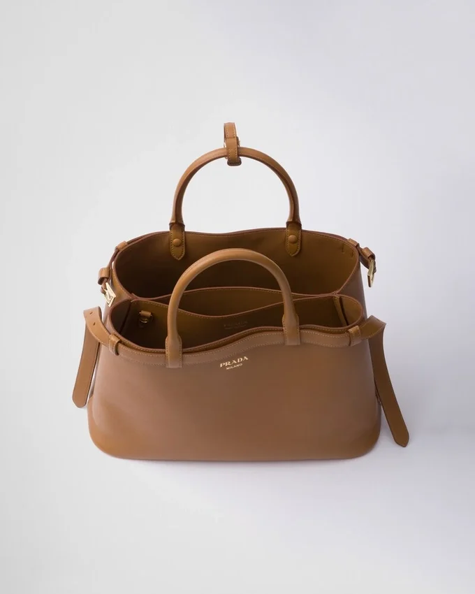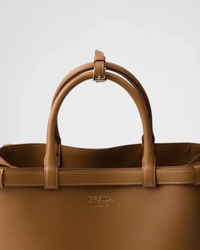 Clean Lines and Refined Elements Tell the Story of Prada’s Dual Aesthetic That Blends Simplicity and Detail, Functionality and Elegance. This Leather Bag Summarizes the Brand’s Stylistic Codes in a Pragmatic but Sophisticated Design, with Nappa Leather Interior Characterized by Three Compartments. The Spacious Silhouette is Animated by the Distinctive Touch of the Leather Belts, Both Refined and Modern. The Hot-Stamped Lettering Logo in 22 Kt Gold Leaf Adds a Precious Signature to the Bag.