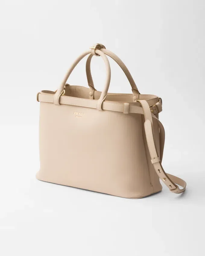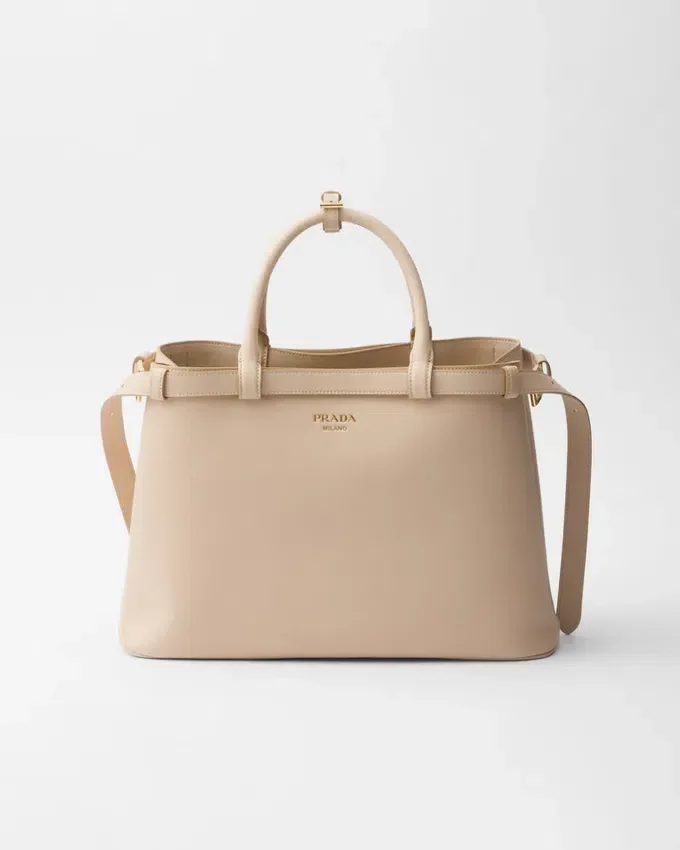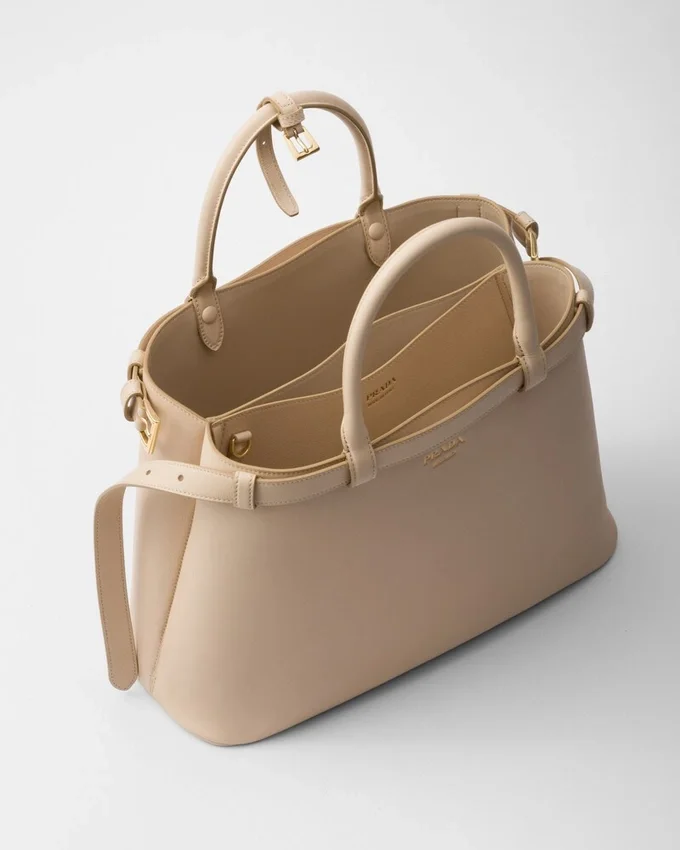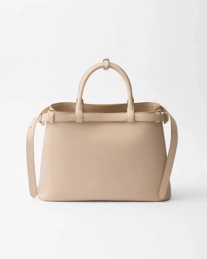 Clean Lines and Refined Elements Tell the Story of Prada’s Dual Aesthetic That Blends Simplicity and Detail, Functionality and Elegance. This Leather Bag Summarizes the Brand’s Stylistic Codes in a Pragmatic but Sophisticated Design, with Nappa Leather Interior Characterized by Three Compartments. The Spacious Silhouette is Animated by the Distinctive Touch of the Leather Belts, Both Refined and Modern. The Hot-Stamped Lettering Logo in 22 Kt Gold Leaf Adds a Precious Signature to the Bag.