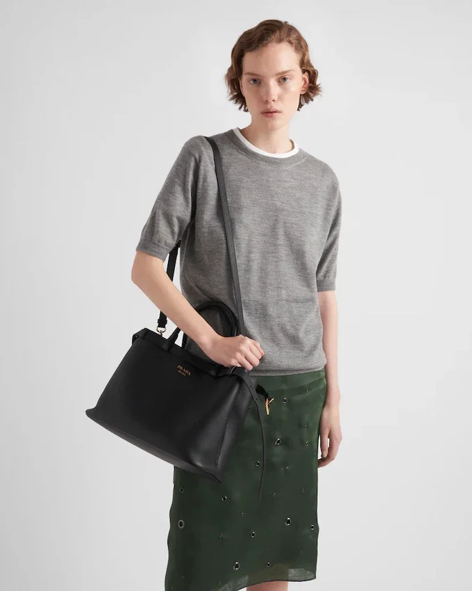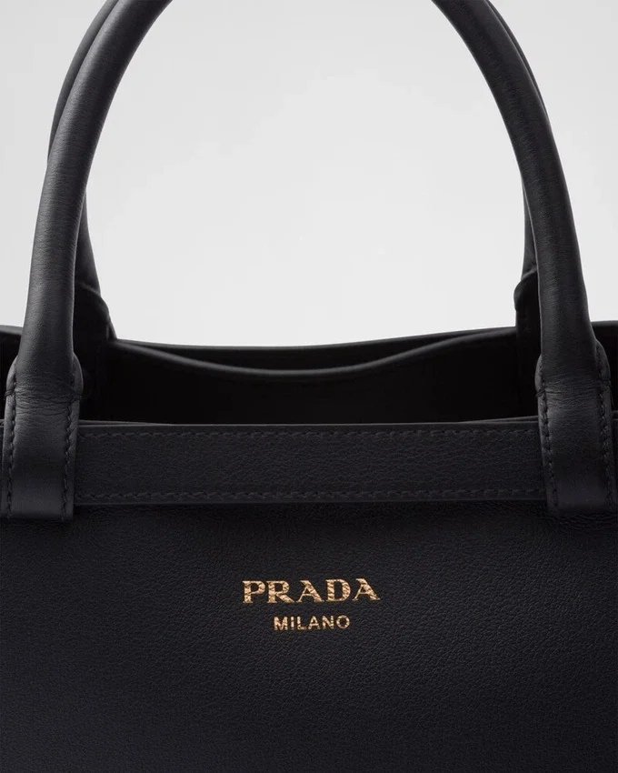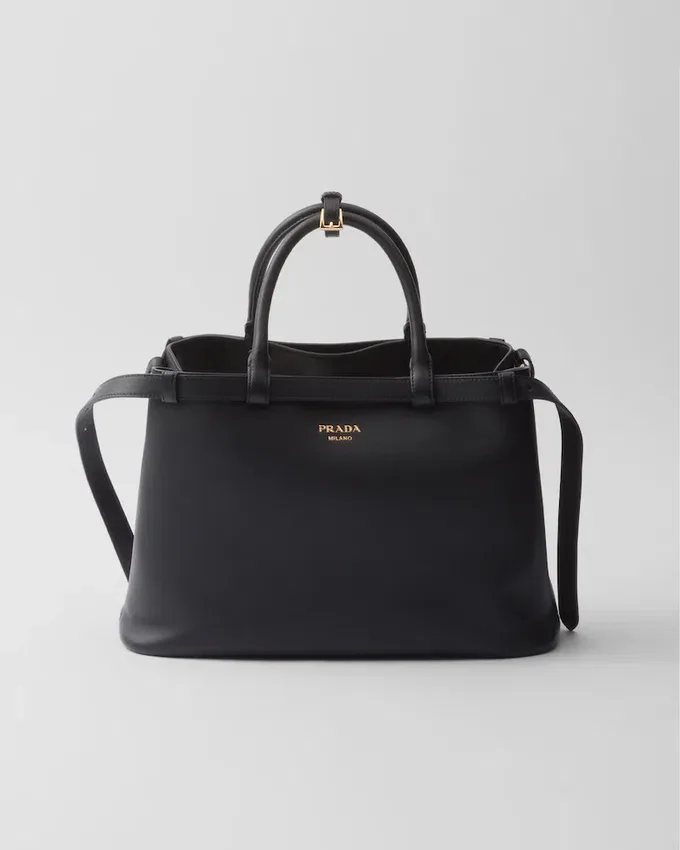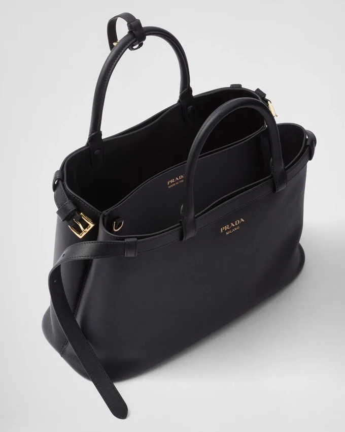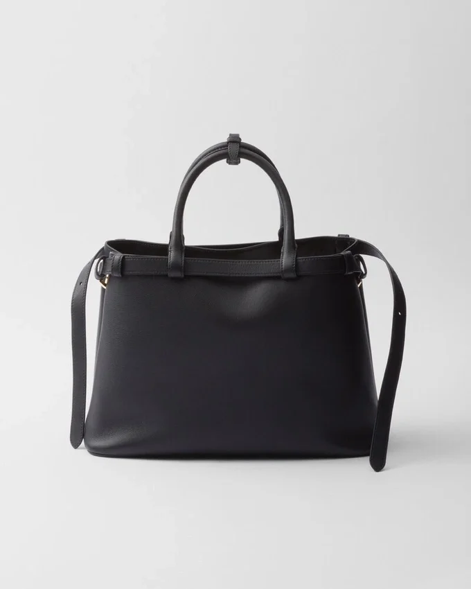 Clean Lines and Refined Elements Tell the Story of Prada’s Dual Aesthetic That Blends Simplicity and Detail, Functionality and Elegance. This Leather Bag Summarizes the Brand’s Stylistic Codes in a Pragmatic but Sophisticated Design, with Nappa Leather Interior Characterized by Three Compartments. The Spacious Silhouette is Animated by the Distinctive Touch of the Leather Belts, Both Refined and Modern. The Hot-Stamped Lettering Logo in 22 Kt Gold Leaf Adds a Precious Signature to the Bag.