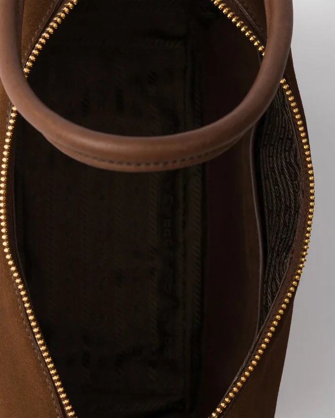 The Silky Touch of Suede Emphasizes the Soft Lines of This Handbag. The Sophisticated and Versatile Style is Brightened by Gold-Tone Hardware and Completed by the Iconic Triangle Logo.