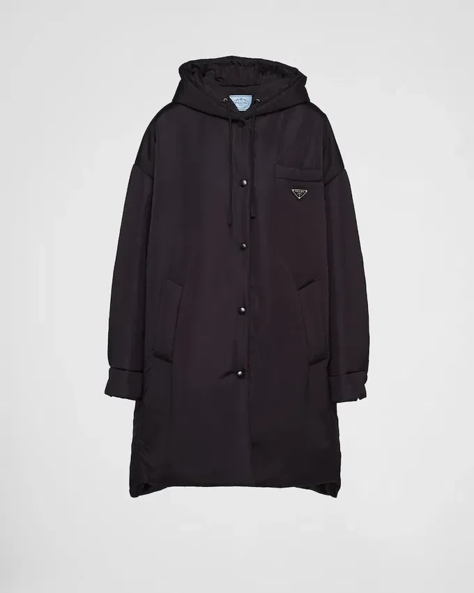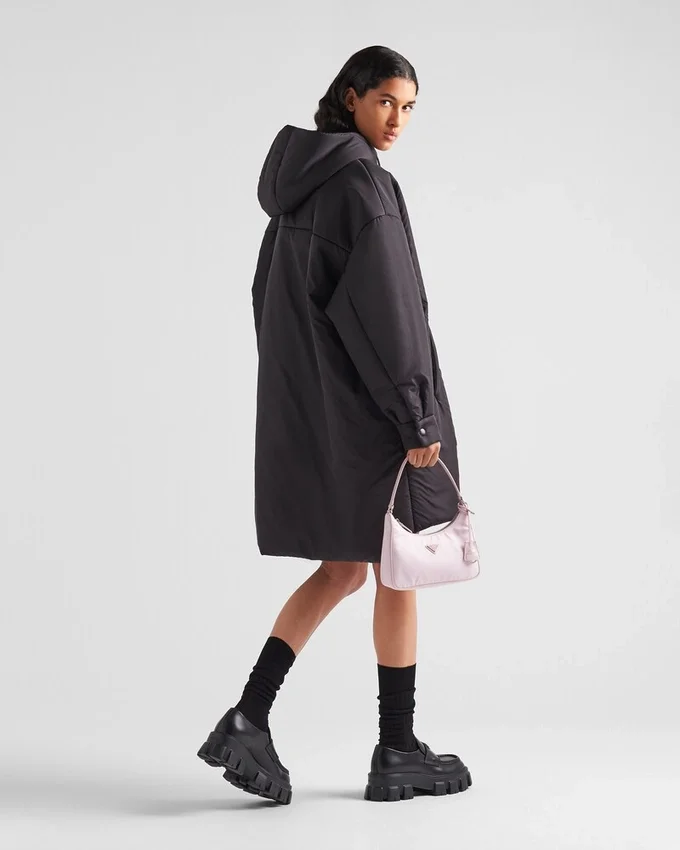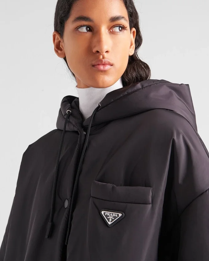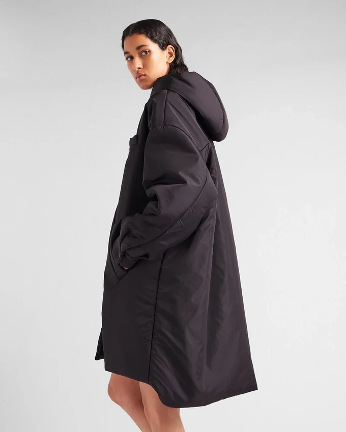 This Oversized Raincoat with Hood and Asymmetrical High-Low Hem Blends Structured Lines and a Sporty Mood. The Enveloping Silhouette Re-Proposes Nylon, First Introduced in the Luxury World by Prada, in a Sustainable Version: Re-Nylon, a Regenerated Yarn Produced from Recycled Plastic Trash Collected in the Ocean. For Sustainable Care to Preserve the Product’s Characteristics and Reduce Microfiber Shedding, We Recommend Not Washing the Item Too Often. Let the Product Air out After Every Use and Have It Dry Cleaned at a Specialized Ecological Dry Cleaners.